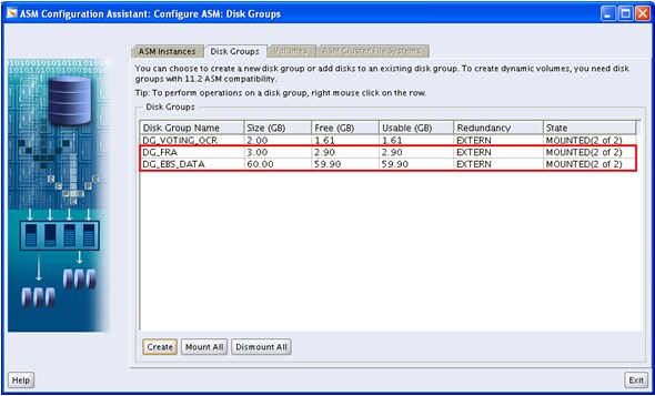 Donde básicamente se crearán los DiskGroups: DG_EBS_DATA y DG_FRA, con la finalidad de luego mover la base de datos a este storage.