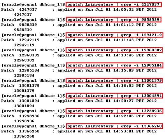 Luego procedemos a aplicar los siguientes parches de Base de Datos: 4247037, 9858539, 12942119, 12960302, 12985184, 13001379, 13004894, 13258936 y 13366268. La aplicación de parches de base de datos se debe realizar mediante el utilitario OPATCH. Los pasos post definidos en la documentación de cada uno de los parches no se debe realizar como parte de este procedimiento.