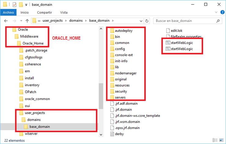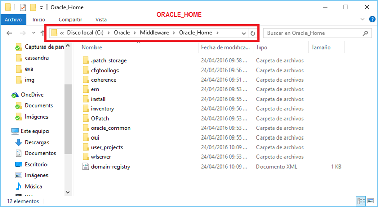 PS C:\Oracle\Middleware\Oracle_Home> ls Directorio: C:\Oracle\Middleware\Oracle_Home Mode LastWriteTime Length Name ---- ------------- ----- ---- d----- 24/04/2016 09:58 p. m. .patch_storage d----- 24/04/2016 09:56 p. m. cfgtoollogs d----- 24/04/2016 09:51 p. m. coherence d----- 24/04/2016 09:53 p. m. em d----- 24/04/2016 09:55 p. m. install d----- 24/04/2016 09:56 p. m. inventory d----- 24/04/2016 09:53 p. m. OPatch d----- 24/04/2016 09:53 p. m. oracle_common d----- 24/04/2016 09:55 p. m. oui d----- 24/04/2016 10:09 p. m. user_projects d----- 24/04/2016 09:53 p. m. wlserver -a---- 24/04/2016 10:09 p. m. 225 domain-registry.xml |