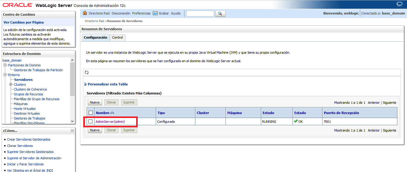 Para este ejercicio asumimos que tenemos un Dominio básico, así que solo existe un servidor el AdminServer.