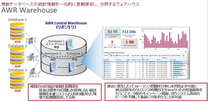 | ① 長期保存の実現 | 長期間のキャパシティプラニング実施が可能になるだけでなく、AWRレポートのアーカイブおよび退避運用が不要になる |