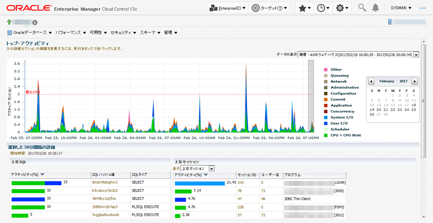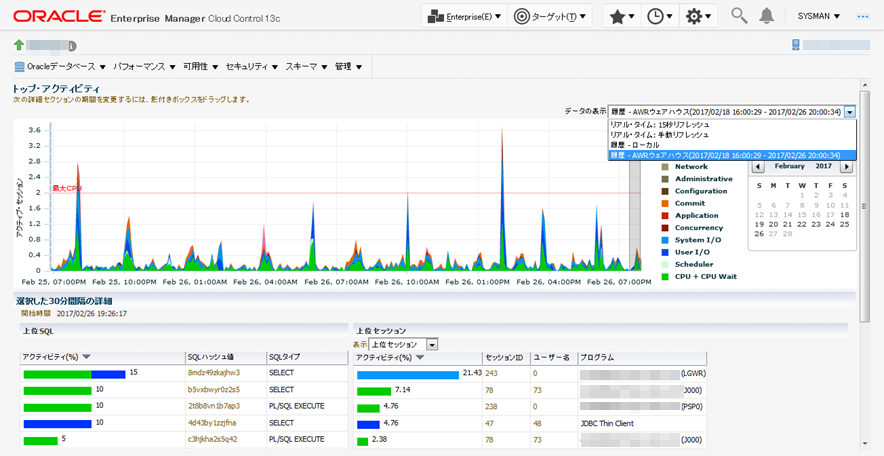 AWR Warehouseダッシュボードより、「パフォーマンス・ホーム」-> 「トップ・アクティビティ」とタブを辿ることでアクセスできます。