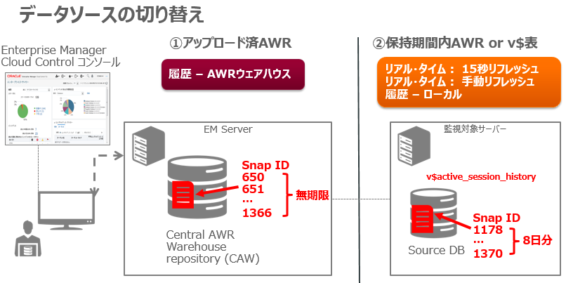 また、AWR Warehouseの分析機能ならではのデータソースの切り替えについても覚えておきましょう。