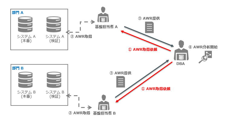 | ② AWRが各DBで管理されている | 本番環境へのアクセス手続きや各担当者との情報連携が必要な為、AWR入手に時間がかかる |