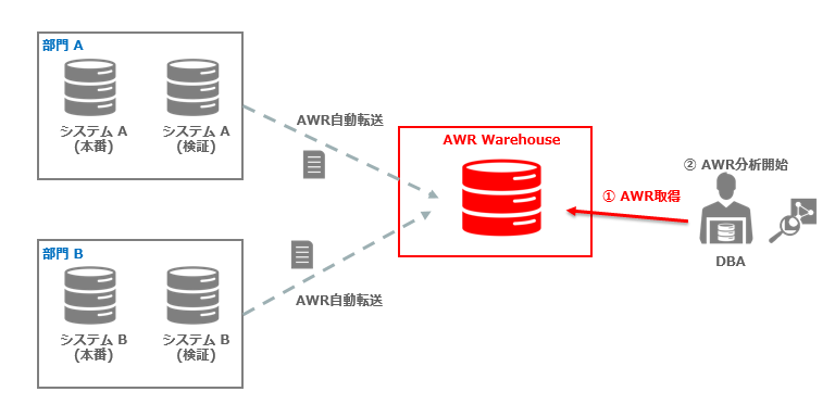 | ② AWRの一元管理 | AWR情報のみを集約した独立したDBの為、DBA担当者が直接アクセスする運用も可能になり、AWR取得にかかる時間が短縮される |