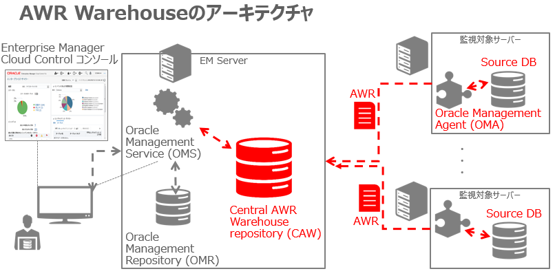 AWR Warehouseのアーキテクチャ図は以下の通りです。