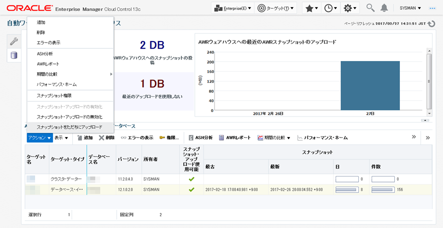 また、特定DBにおいて緊急の分析が必要となった(AWR抽出間隔を待てない)場合などにAWR Warehouseダッシュボードより任意のタイミングでAWRのアップロードを実行することも可能です。