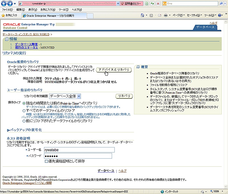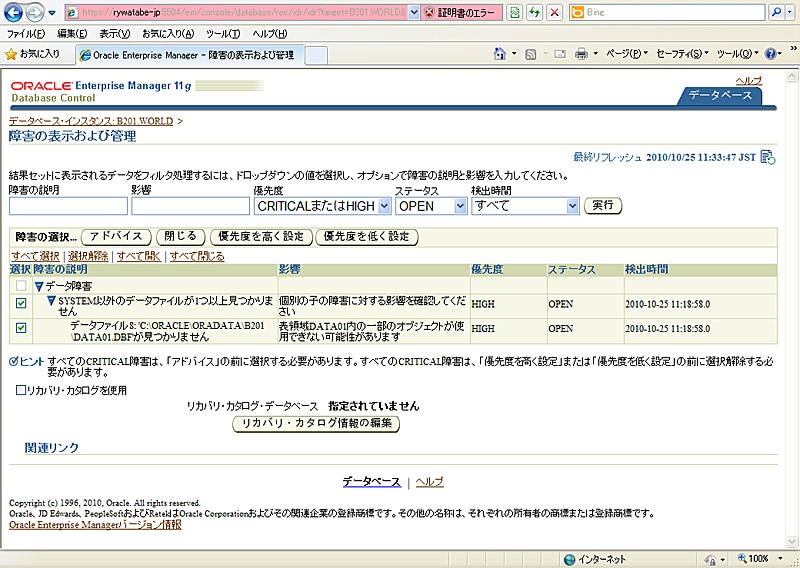 以下の画面は、データファイルの一部が破損した例です。「リカバリの実行」画面から「アドバイスとリカバリ」を選択すると、データ・リカバリ・アドバイザが認識している障害内容を確認し、推奨されたリカバリ方法を適用することができます。