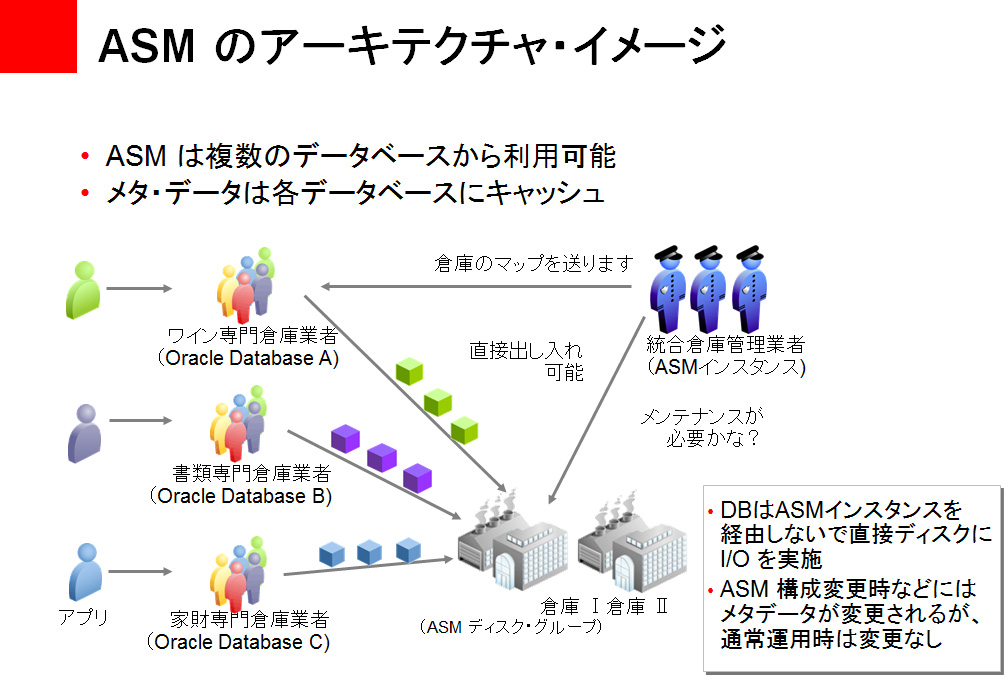 ス)が荷物の出し入れを行う。どの倉庫に何が保管されているのかは、総合倉庫管理業者(ASMインスタンス)が管理する。各倉庫業者は、総合倉庫管理業者