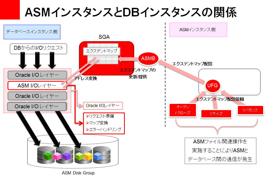 る情報の1つで、データの保存場所が書かれたリストである。このエクステントマップをSGAに配信するのがASMインスタンスというわけだ。