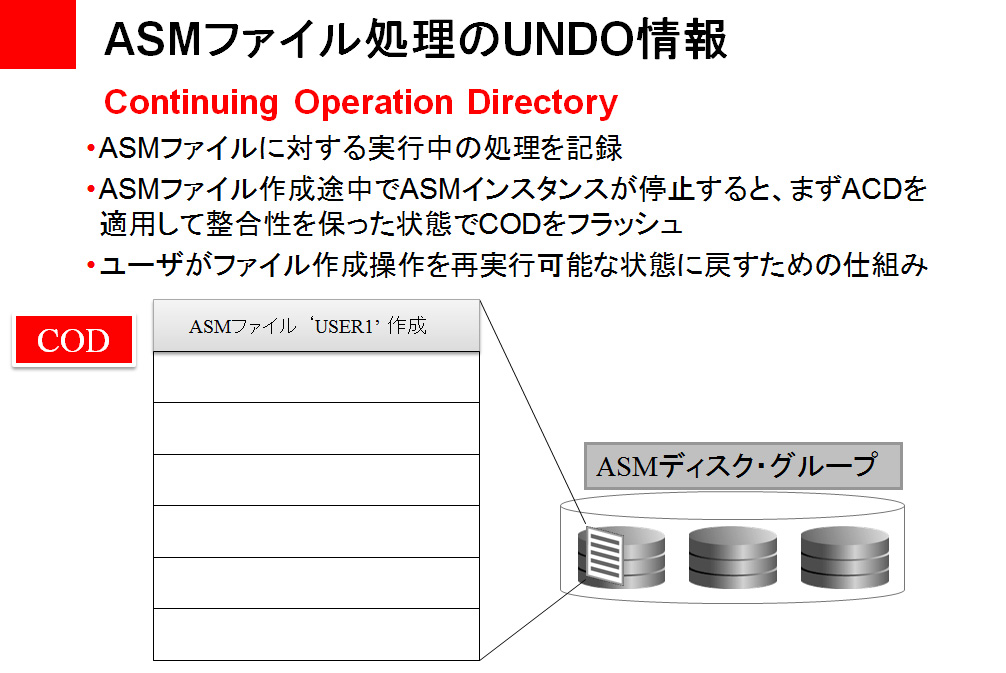 ASMは、まずACDを適用して最低限、整合性のとれた状態に回復した後、CODに基づいて途中で処理が終わってしまったファイル作成をロールバックする