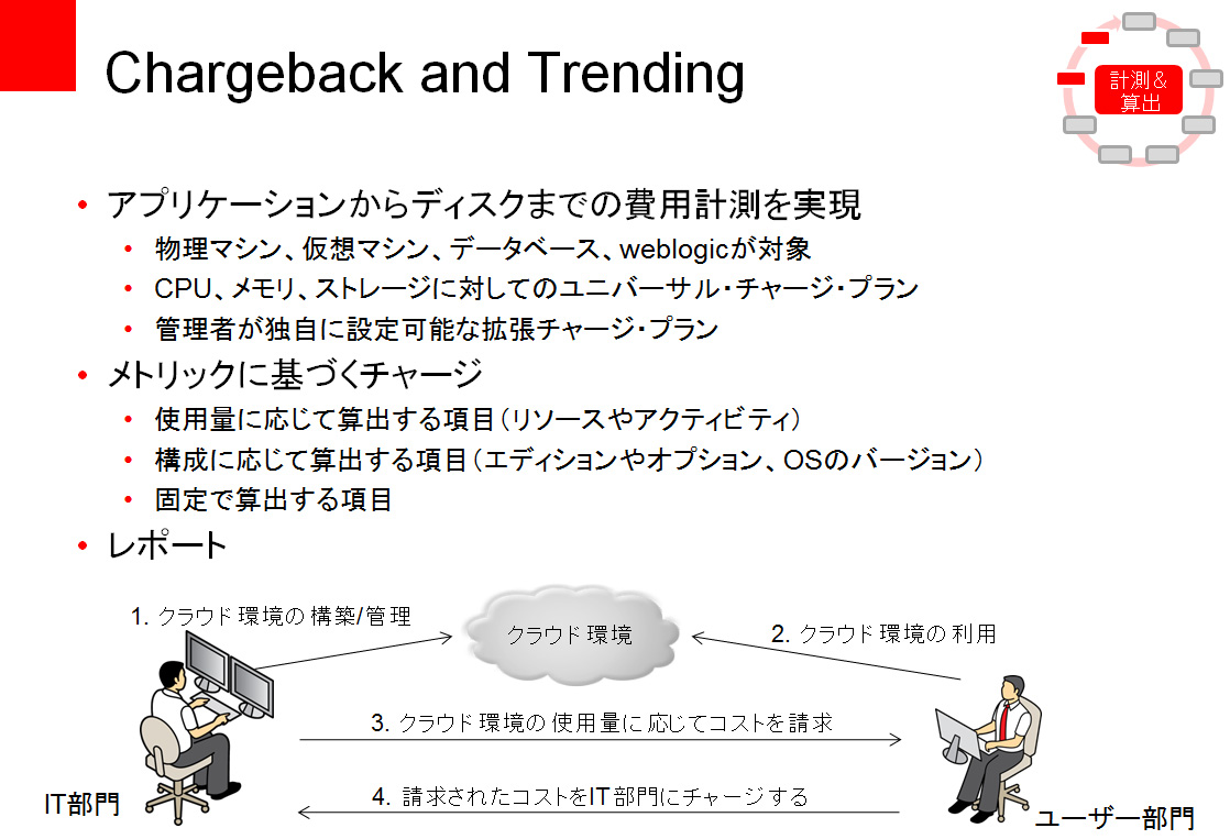 また、このようにしてプライベート・クラウドを構築した場合、個々のユーザー部門の利用状況に応じて課金を行うケースが一般的である。これを