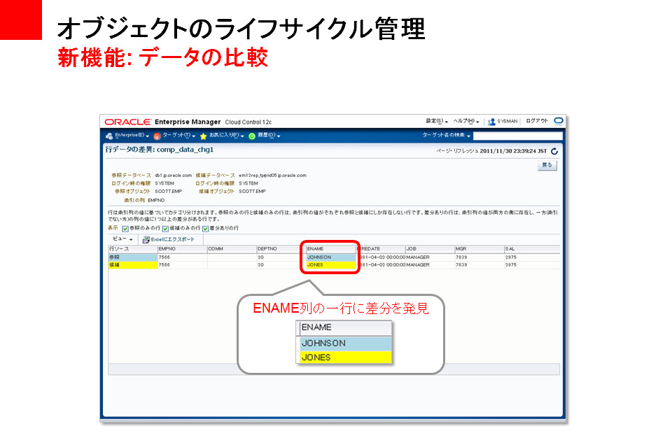 12cでは、この構成管理の機能も強化されている。これまでは単にオブジェクトの定義しか比較できなかったが、12cでは表データの内容まで比較すること
