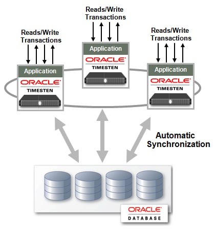 スタンドアロンのTimesTenデータベースと同様に、Oracle TimesTen Cacheは、トランザクション・レプリケーションの組込みメカニズムにより、キャッシュ・データベースの高可用性を実現します。ほとんどのエンタープライズ・アプリケーションでは、アプリケーションの停止時間は許容されません。そのため、大多数のデプロイメントでは、高可用性とロードバランシングのためにTimesTen Cacheレプリケーションが追加されます。