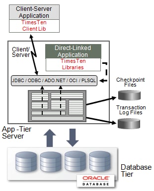Oracle TimesTen Application-Tier Database Cacheは、Oracle TimesTen In-Memory Database(Oracle TimesTen)を使用して構築されており、マルチユーザーおよびマルチスレッド・アプリケーションのアプリケーション層にデプロイされます。アプリケーションは、標準SQLを使用して、JDBC、ODBC、ADO.NET、Oracle Call Interface(OCI)、Pro*C/C++、Oracle PL/SQLといったプログラミング・インタフェース経由でキャッシュ・データベースに接続し、キャッシュ表にアクセスします。キャッシュ表は、Oracle TimesTenデータベース内にある通常のリレーショナル表と同じように処理されます。また、永続性とリカバリ可能性を備えています。