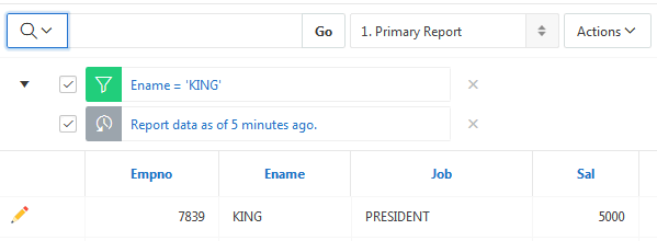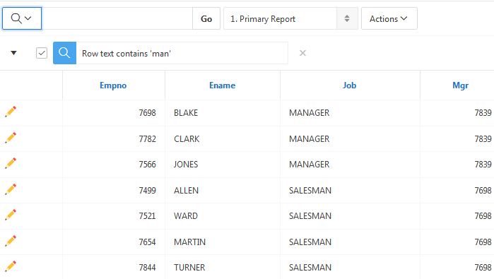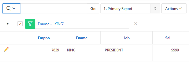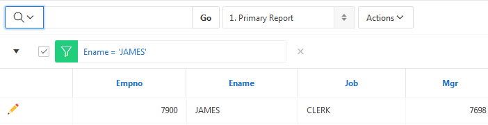 | 単一行表示 単一行の詳細を同時に表示するには、表示する行のSingle Row Viewアイコンをクリックします。表示が可能な場合は、単一行表示は常に最初の列に表示されます。インタラクティブ・レポートのカスタマイズに応じて、単一行表示は、標準の表示の場合と更新が可能なカスタム・ページの場合があります。