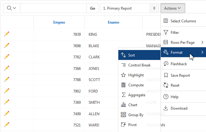 | Actionsメニュー Actionsメニューには、インタラクティブ・レポートの操作に役立つ数多くのタスクが含まれています。