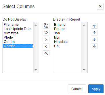 | Select Columns Select Columnsを使用して、表示する列を変更します。右側にある列は表示されます。左側にある列は表示されません。右端の矢印を使用すると、表示される列の順序を変更できます。計算された列は**が付いています。