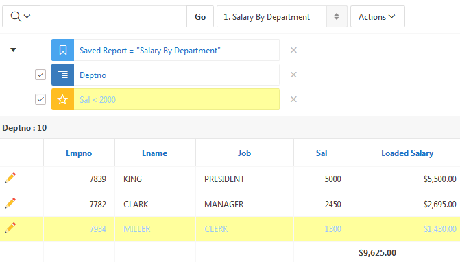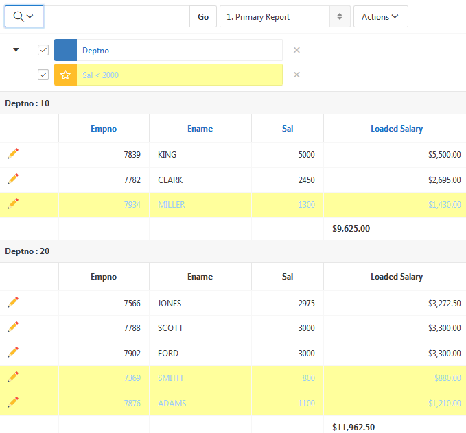 | Control Break、Highlight、Compute、Aggregate Control Breakを使用して、1つまたは複数の列のブレーク・グループを作成します。インタラクティブ・レポートから列が抽出され、マスター・レコードとして表示されます。Highlightを使用すると、フィルタを定義できます。フィルタに関連する特性を使用して、フィルタを満たす行がハイライトされます。行全体をハイライトすることも、対象のセルだけをハイライトして、バックグラウンドとテキストの両方に新しい色を選択することもできます。Computeを使用すると、計算された列をレポートに追加できます。これには、NBR_HOURS/24などの数学的計算や、既存の列に適用される標準のOracle関数を使用できます(一部の関数は表示されており、TO_DATEなども使用できます)。Aggregateは、列に対して実行される数学的計算です。Aggregateは、各コントロール・ブレークの後とレポートの最後で、定義された列内に表示されます。