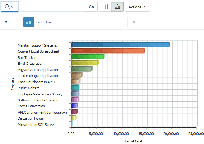 | グラフ インタラクティブ・レポートごとに1つのグラフを含めることができます。定義した後は、検索バー内のアイコンを使用して、グラフとレポートのビューを切り替えることができます。使用できるグラフの種類は、横棒、縦棒、円、または折れ線グラフです。