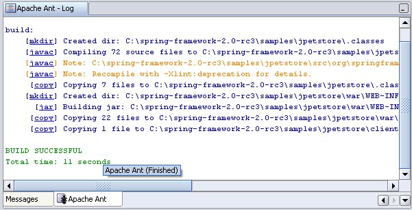ただし、このチュートリアルでは、必要なライブラリの収集をより簡単におこなうため、Springサンプルに含まれるAntスクリプトを使用して、サンプルの構築とすべてのライブラリのリポジトリ作成を実行します。