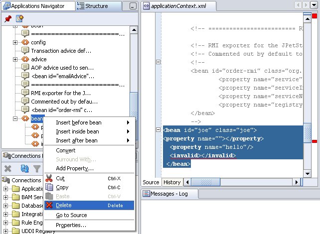 Structureウィンドウでは、ファイルの編集もおこなえます。たとえば、さきほど追加した最後の「 bean」エントリを右クリックして、「 delete」を選択することで削除できます。