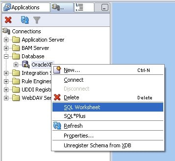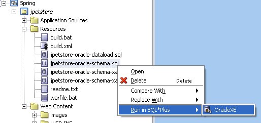 アプリケーション・ナビゲータで「 Resource」ノードを展開します。「 jpetstore-oracle-schema.sql」ファイルを右クリックして「 Run in SQL*Plus」を選択し、接続名を選択します。
