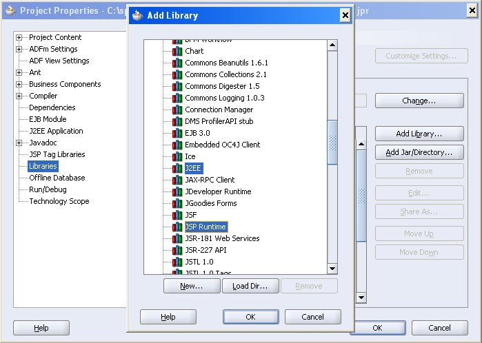 Project Propertiesウィンドウで、「 Add Library」ボタンをクリックして下にスクロールし、(Extensionsノード下の)J2EEライブラリとJSP Runtimeライブラリを探して、それらをプロジェクトに追加します。