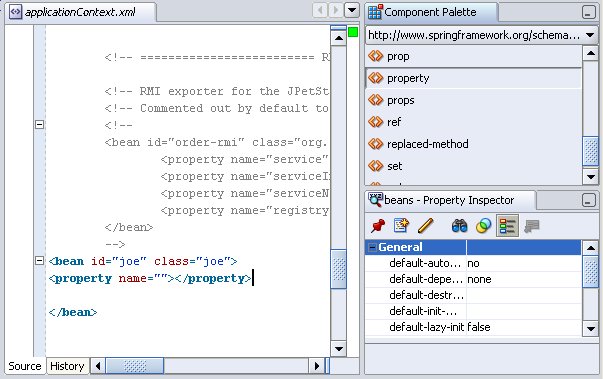 たとえば、コンポーネント・パレット・ウィンドウ([Ctrl]+[Shift]+[P]でウィンドウ表示)で、「 http://www.springframework.org/schema/beans 」スキーマを選択します。これで、XMLファイルのbeanタグ内に propertyタグをドラッグできます。