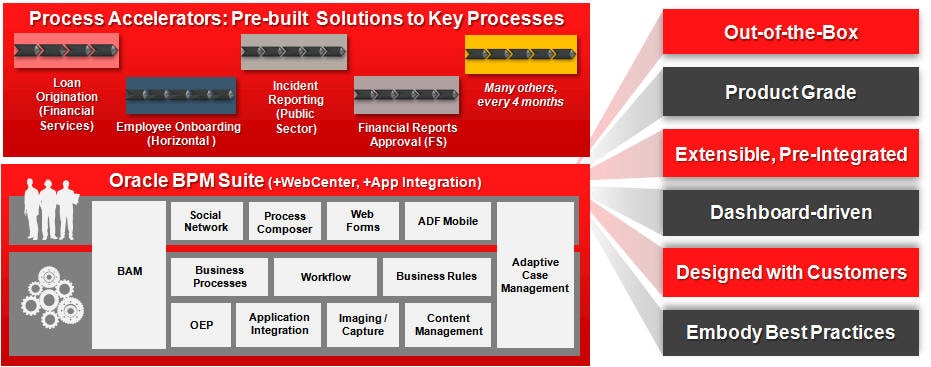 Oracle Process Accelerators(Oracle PA)は事前構築済みのBPMソリューションです。追加設定なしですぐに導入でき、BPMの拡張性を最大化するように設計されています。Oracle PAは、Oracle Software Quality Assuranceプロセスに従ってテストされた製品品質を備え、ベスト・プラクティスのプロセス・モデルやビジネス・ルール、UI、ダッシュボードに加え、必要に応じてOracleアプリケーションとの統合を含む完全なソリューションです。 Oracle Process Acceleratorsは、業界特有の重要なプロセスと、あらゆる業界に共通するビジネス・プロセスの両方をターゲットにしています。