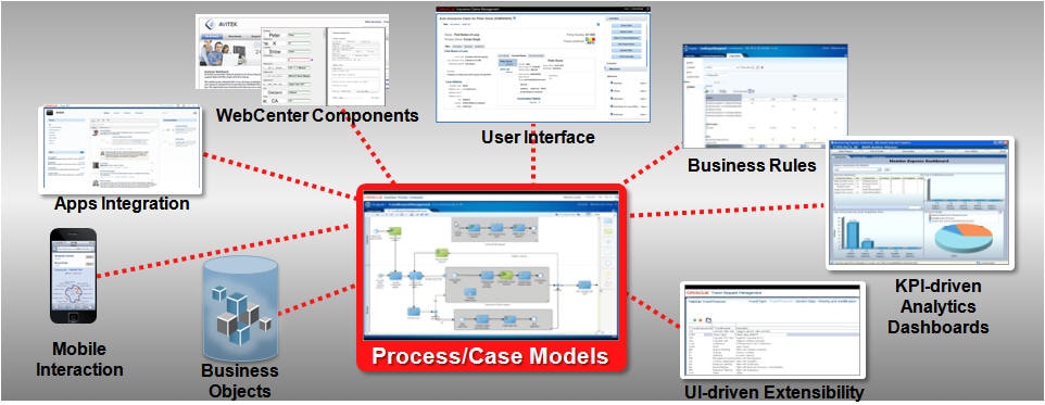 ![]() BPMNプロセス・モデル 再利用可能で拡張可能なデータ・モデル Human Workflow(事前構築済みのADFユーザー・インタフェース) 構成可能なOracle Business Rules SOAビジネス・サービス Oracle Business Activity MonitoringダッシュボードとOracle BPEL Process Analytics Oracle Event Processing WebCenter Content/Imaging/Portal Application Integration |