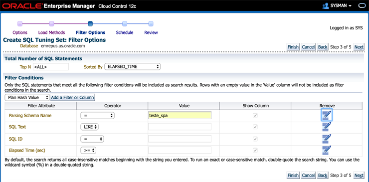 Informamos o schema “TESTE_SPA”, que é o usuário em que foram executadas as queries que queremos capturar: