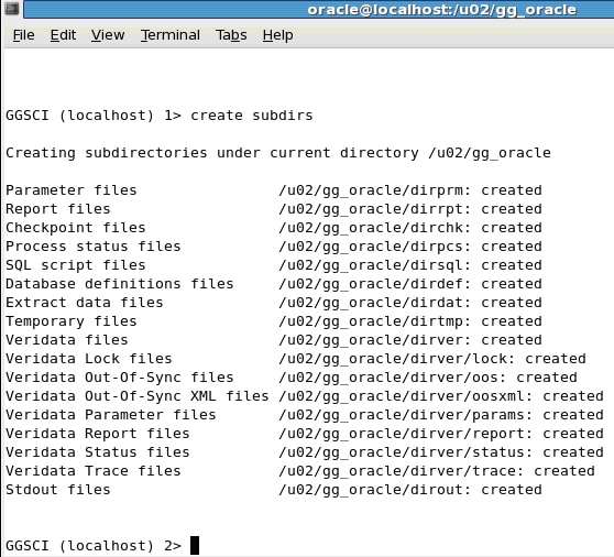 10. Execute o comando ./ggsci para entrar na interface de gerenciamento GGSCI do OGG. Dentro do GGSCI execute o comando CREATE SUBDIRS. Feche o GGSCI.