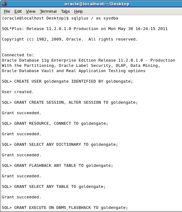 4. Salve o arquivo e feche o editor de texto. Com as variáveis de ambiente configuradas, abra uma conexão com o banco de dados utilizando algum cliente (como o SQL*Plus e SQLDeveloper) e crie um usuário para o Oracle GoldenGate. Dependendo da função (origem e/ou destino) do banco de dados, diferentes permissões para o usuário são necessárias, como mostra a tabela abaixo.