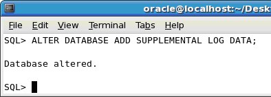 5. Para que o OGG replique corretamente updates e deletes, é necessário que o log suplemental a nível de banco de dados, que garante que a chave de identificação única de cada linha esteja no log, seja ativado. Abra uma conexão com o banco de dados utilizando algum cliente (com a permissão necessária) e execute o comando ALTER DATABASE ADD SUPPLEMENTAL LOG DATA;.