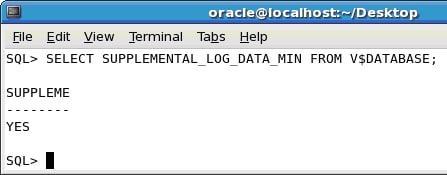6. Certifique-se de que o log suplemental a nível de banco de dados está ativo utilizando o comando SELECT SUPPLEMENTAL_LOG_DATA_MIN FROM V$DATABASE;. A saída deve ser YES ou IMPLICIT.