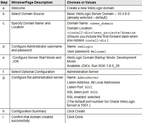Enter the following information in the following steps to create a WebLogic server domain using the wizard.