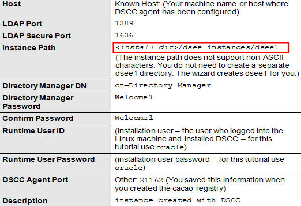 Note: You will use the password that you choose for directory service manager, to authenticate in the DSCC login page and it is also used as a DSCC registry password. To simplify, use Welcome1 for directory service manager and weblogic domain password throughout this tutorial.