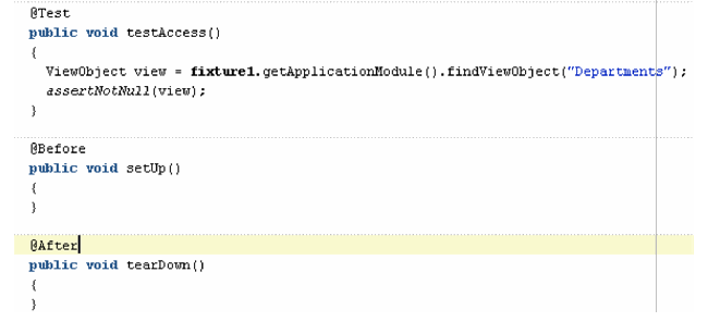 The Oracle JDeveloper –generated test class has one test method called testAccess that attempts to get a View Object instance from an application module (the application module was created by a test fixture— more on that later) and uses a JUnit assertion to ensure that the obtained View Object is not null. This is a common pattern for a unit test within JUnit: perform a test and then use one of the assert methods to verify the result. If the assertion is not true, then JUnit will flag the particular unit test as failed.