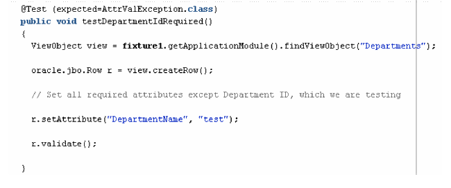 As you can see, the basic unit test generated by the wizard is quite simplistic. Let’s write our own unit test for this View Object to test that the Department ID attribute is being enforced as required. We can write such a unit test by creating a row, not setting the Department ID, validating the row, and seeing that the proper exception is thrown. But, how do we tell JUnit that we expect to see an exception (and furthermore that the test should fail if the exception is not thrown)? We do that by using the expected attribute of the @Test annotation to tell JUnit that we expect to see a certain exception. Oracle ADF should throw an oracle.jbo.AttrValException in the case we don’t supply a required attribute, so we can code our unit test like this: