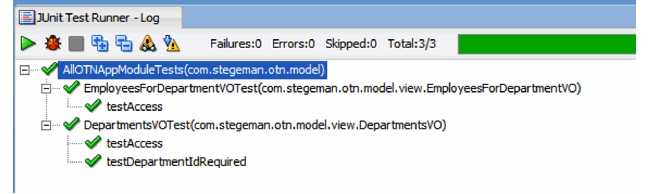 From this example, you can see that two unit tests were run and that both of them were successful (no failures or errors). Now, let’s have a look at the actual code behind the generated unit tests and add some of our own tests. Double-click the DepartmentsVOTest.java file in the Application Navigator to open the source code for the unit tests of the DepartmentsVO View Object: