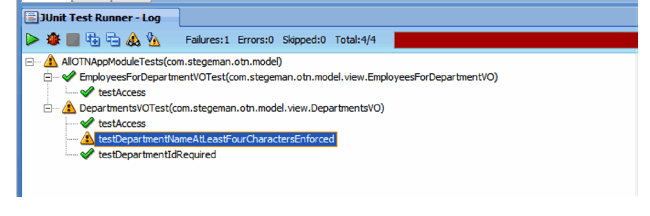 Before we have a look at the code itself, let’s run the generated test cases and see what happens. JUnit uses the concept of a test suite to group tests together, so let’s run the generated test suite using Oracle JDeveloper’s JUnit test runner. To do so, right-click the test suite class (AllOTNAppModuleTests.java) in the Application Navigator and choose Run from the context menu: