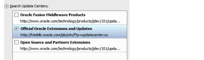 2. Ensure that, at a minimum, you have selected the “Official Oracle Extensions and Updates” update center, and click Next: