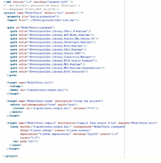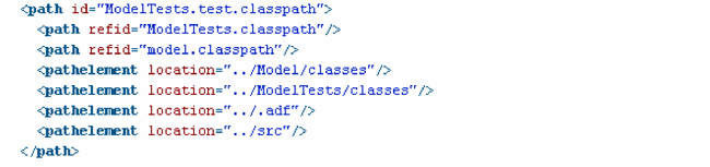 Next, we need to define a classpath for executing the Tests. The classpath will need to include the ModelTest project’s classpath, the Model project’s classpath, the output from both of those projects, and the .adf and src directories for the application (to get connection information). The resulting classpath in build.xml looks like this: