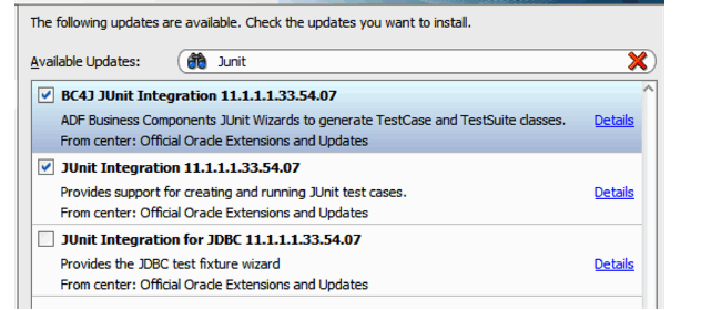 3. Type JUnit in the search box to search for the updates. At a minimum, include the BC4J JUnit Integration and JUnit Integration extensions, and click Next: