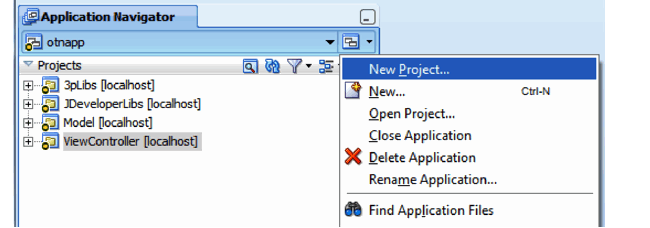 Because keeping unit tests separate from the rest of the application code will make it easier to create deployment artifacts such as EAR files that do not include the unnecessary-for-deployment unit tests, I usually create a separate project to hold the unit tests. Because we are going to create unit tests for our Model (Business Components) project, let us create a new project called “ModelTests” to hold the unit tests. With the otnapp application open in the Oracle JDeveloper IDE, choose New Project from the Application Navigator shortcut menu: