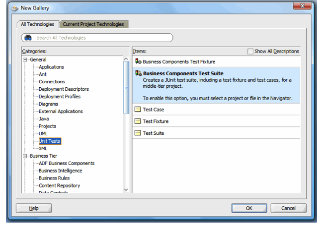 As you add more test classes to your project, you can simply update the test suite’s @Suite.SuiteClasses annotation to include your newly created test classes. You can also create additional test suites simply by creating a new class and adding the annotations manually, or by using the Oracle JDeveloper JUnit Test Suite Wizard to create the class for you. To invoke the wizard, you can right-click your test project in the Application Navigator and click New..., and in the New Gallery that appears, select the Unit Tests category and Test Suite item (you may need to select the All Technologies tab to see the Unit Tests category):