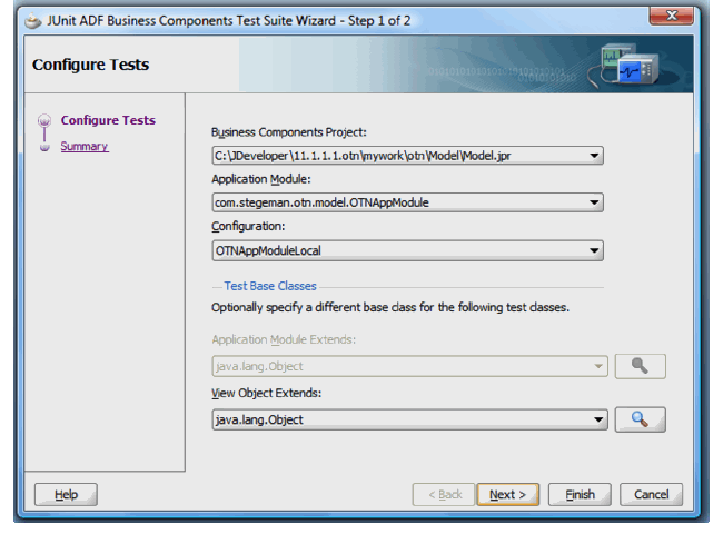 On the first page of the JUnit ADF Business Components Test Suite Wizard, ensure that the Business Components Project (Model.jpr) is selected and that the proper Application Module (OTNAppModule) and Configuration (OTNAppModuleLocal) are selected, and clickFinish: