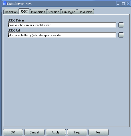 Change to the JDBC tab and populate as shown in the figure below. You need to replace <host> with the server network name or IP address, <port> with the listener port number (usually 1521), and <sid> with the instance service name (Oracle SID).