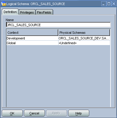 For the Development context, select ORCL_SALES_SOURCE_DEV.SALES_SOURCE from the Physical Schema drop-down menu. Click OK.
